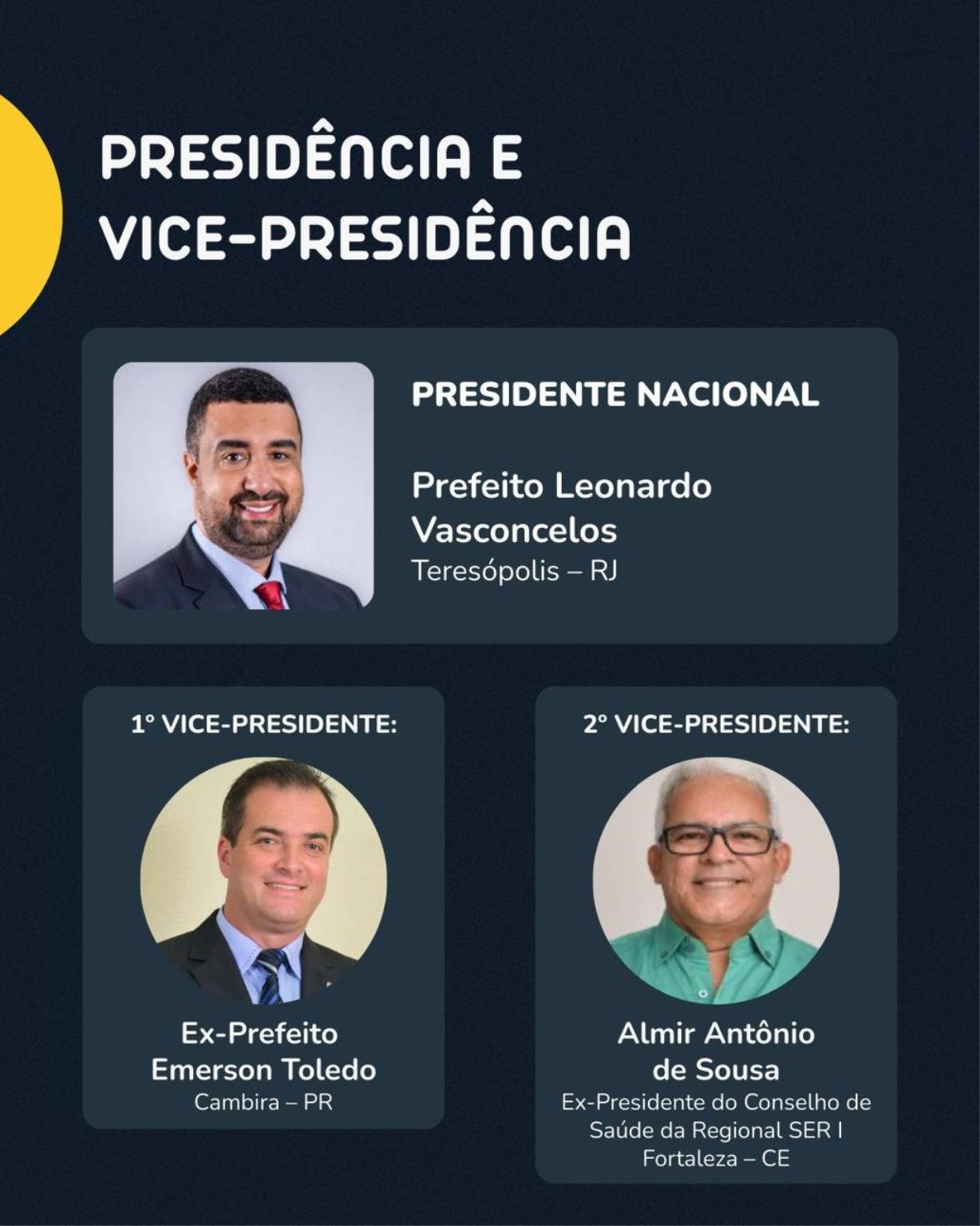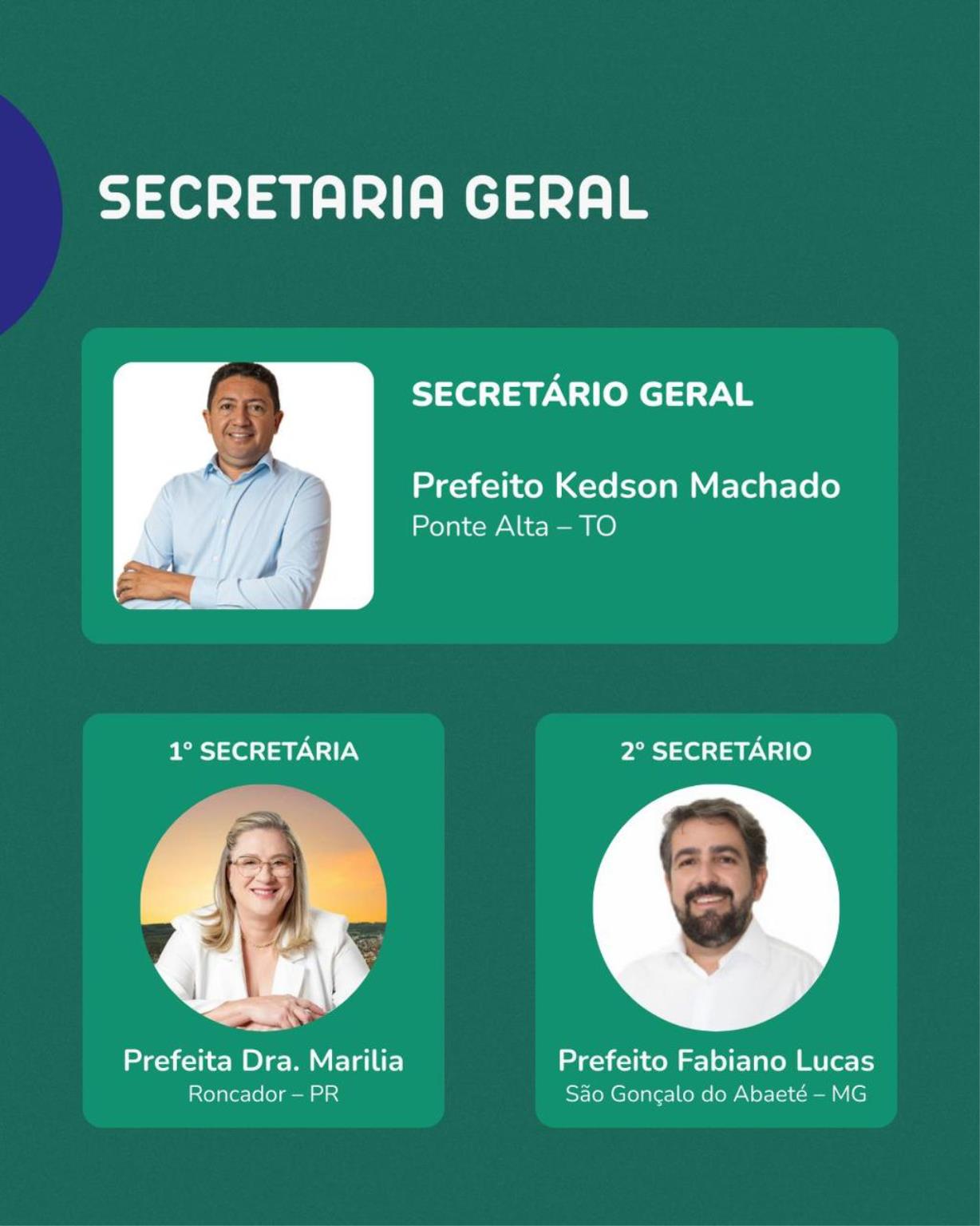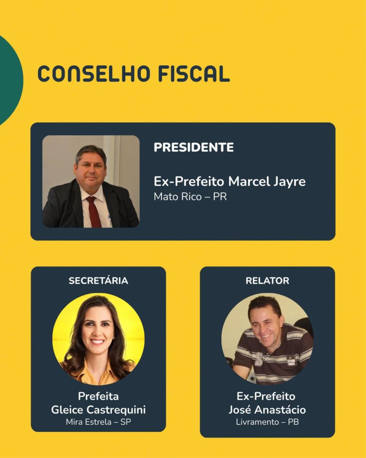 Integram a diretoria: o 2º vice-presidente Almir Guilherme; o secretário-geral, prefeito Kedson Machado (TO); a 1ª secretária, prefeita Dra. Marília Perrota; o 2º secretário, prefeito Fabiano Lucas (MG); o presidente de honra e responsável pela administração financeira, Leonardo Santana (PB); a superintendente nacional, Alandy Cavalcante (AP); o secretário executivo, Eliseu Rezende (RJ); no Conselho Fiscal, o ex-prefeito Marcel Jayre (PR); como 2º conselheiro fiscal, o prefeito Bruno Mineiro (AP); a secretária, prefeita Gleice Castrequini (SP); o relator, ex-prefeito José Anastácio (PB); secretária da presidência Ana Carolina Antunes Gondomar (GO), consultor júridico Dr. Thiago Mota.